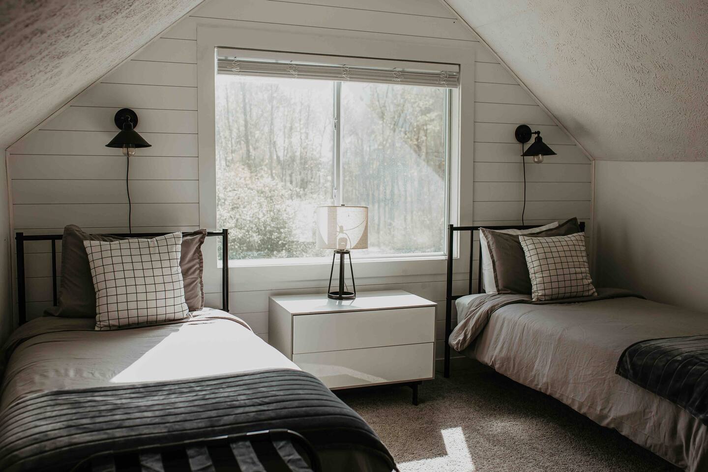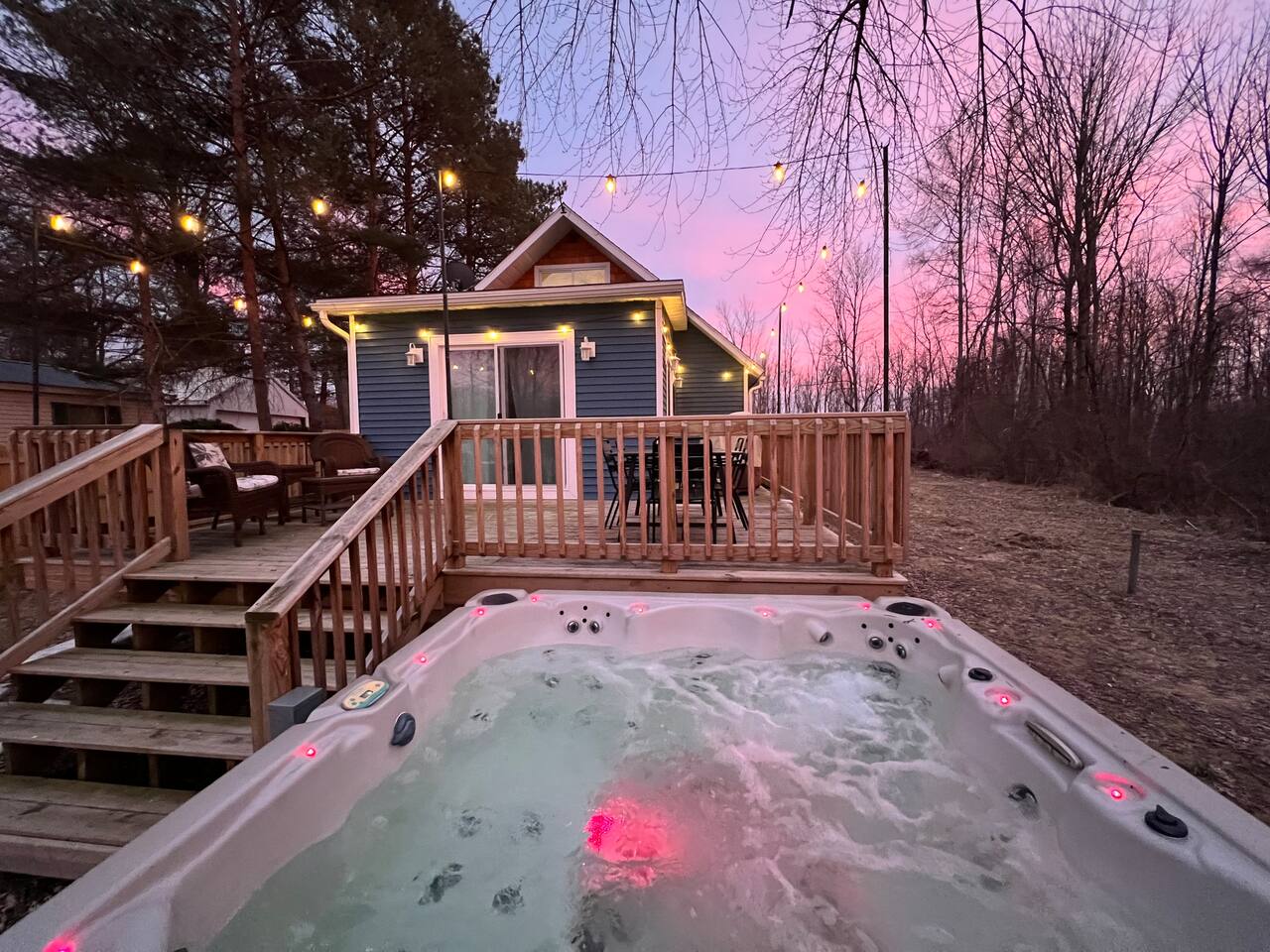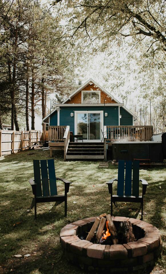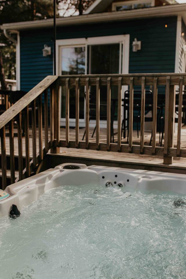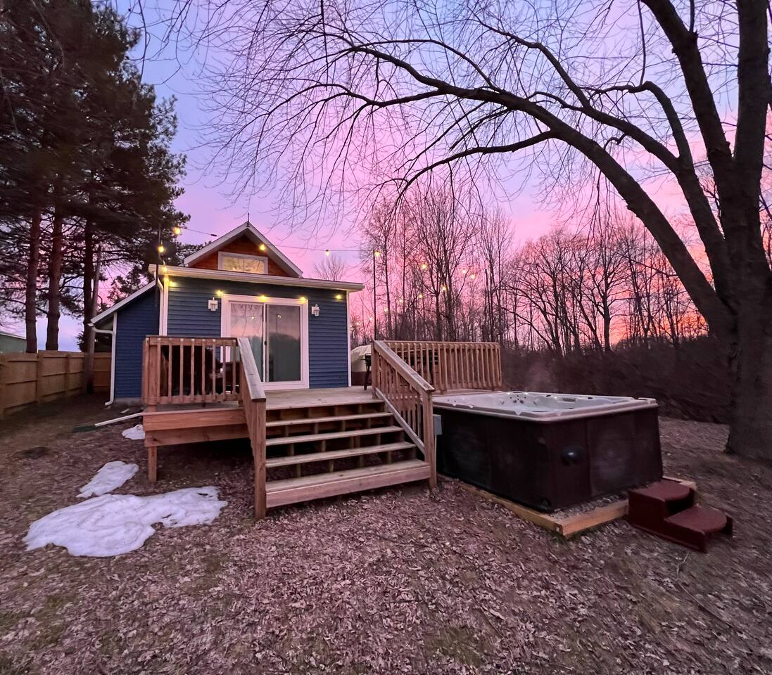 Our modern-rustic cottage is designed for comfort and connection. The open-plan living area features a cozy couch with a pull-out memory foam mattress, a Roku TV for your streaming services, and a collection of board games for fun-filled evenings. Gather for meals at the large dining room table with seating for your entire group. KEY FEATURES: Fully Equipped Kitchen: Prepare delicious home-cooked meals with a full suite of cookware, a coffee pot, a tea kettle, and a blender. Please note, the cottage uses hard well water; we recommend bringing bottled water for drinking. Primary Bedroom: Unwind in a comfortable queen bed with a hotel-grade mattress. This room also includes a desk for any work needs and a safe for your valuables. Loft Bedroom: The cozy loft, overlooking the lake, offers two twin beds—a perfect space for kids or additional guests. Renovated Bathroom: Refresh in the newly renovated, modern bathroom, complete with a walk-in shower. We provide shampoo, conditioner, body wash, Q-tips, and a full set of bath, makeup, and beach towels. OUTDOOR LIVING & LAKE ACCESS: Step outside to your private oasis. The spacious deck includes a propane Blackstone grill and comfortable seating, with string lights for magical evenings. After a day of adventure, soak in the luxurious 6-person hot tub overlooking the peaceful waters. Your stay includes direct access to Lake Forest for great fishing or exploring with our provided kayaks and a pedal boat. Please note: Kayaks and the pedal boat are available in the Spring/Summer and stored for the winter starting November 1. The lake has a natural shoreline with lily pads and mud. We provide beach towels but strongly recommend you bring water shoes. For swimming, we suggest using a kayak or the pedal boat to reach deeper waters.
